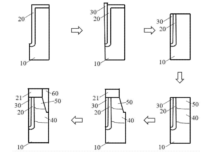 1、提供一P型外延襯底,并在P型外延襯底上刻蝕形成溝槽,在P型外延襯底的表面和溝槽上沉積預設厚度的第一介質層20。溝槽的深度為1μm-1.5μm。預設厚度為400?-700?。當預設厚度太薄時,無法有效地隔離襯底與柵極,造成短路。第一介質層20的生長溫度為800℃-1100℃,通過熱氧和高溫的方式,能提高第一介質層20的致密性和平整性。