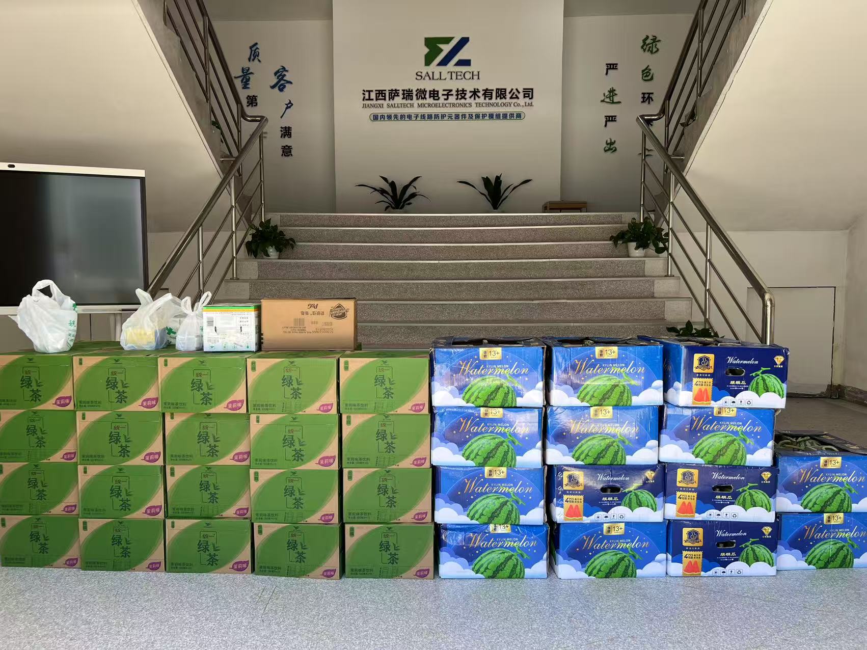 這份 “降溫大禮包” 可真是貼心又實用,里面有清熱解暑的綠茶飲品,一口下去,瞬間驅散了工作帶來的疲憊;還有新鮮多汁的西瓜,是夏日里最受歡迎的美味;舒膚佳香皂能幫助職工們在忙碌工作后清潔肌膚,帶來潔凈舒適的體驗;而金銀花則具有清熱解毒的功效,讓大家在夏日里多一份健康保障。